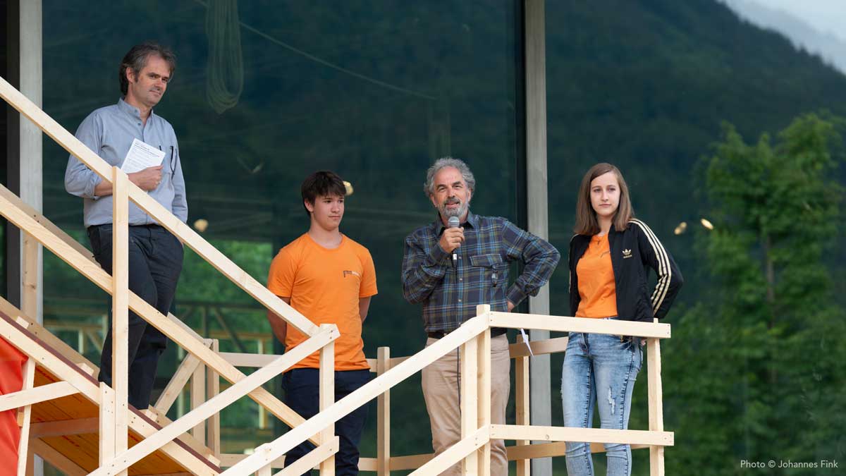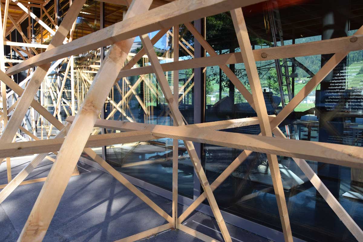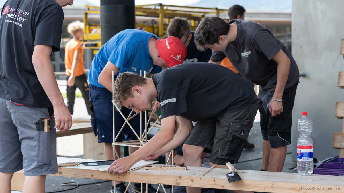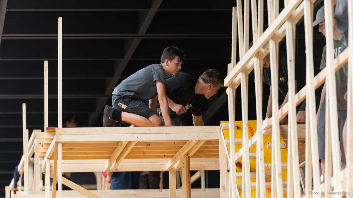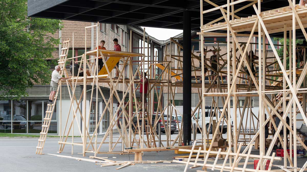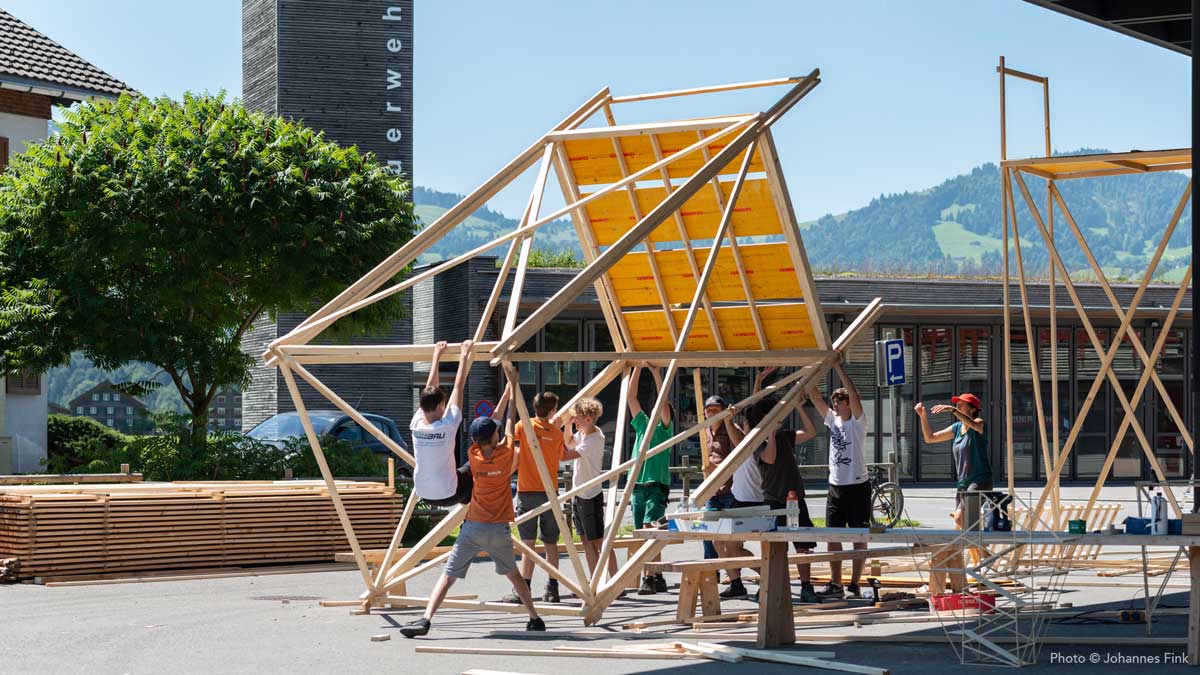Die next Generation des Handwerks – rund 60 Jugendliche – bauten eine räumliche Struktur aus Holz, die sich in Anlehnung an die Ausstellung Alphabet des Lebens — Lernwerkstatt Natur an Bauprinzipien der Natur orientierte