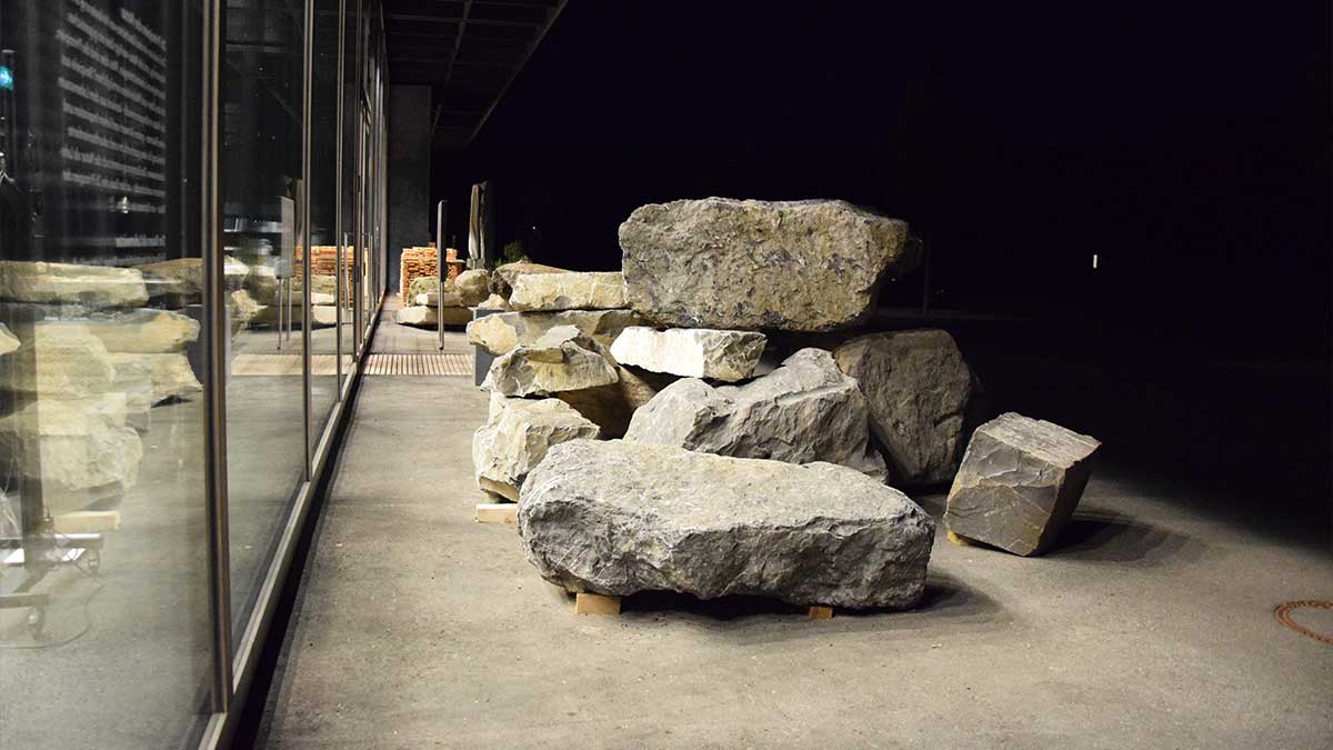 an installation of naturally grown stone furniture attracts bikers, people who walk by and visitors of the Werkraumhaus to have a seat. The raw design of the furniture is a signal and reminder that stone is a non-renewable resource.